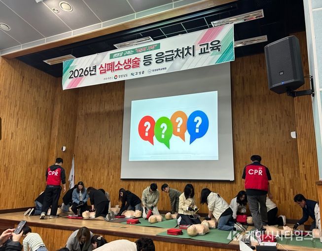 (케이시사타임즈) 고성군은 4월 23일부터 24일까지 이틀간 고성군농업기술센터 2층 친환경농업연구소 강당에서 법정의무교육대상자 등 100여 명을 대상으로 ‘2026년 심폐소생술 등 응급처치 교육’을 실시했다.