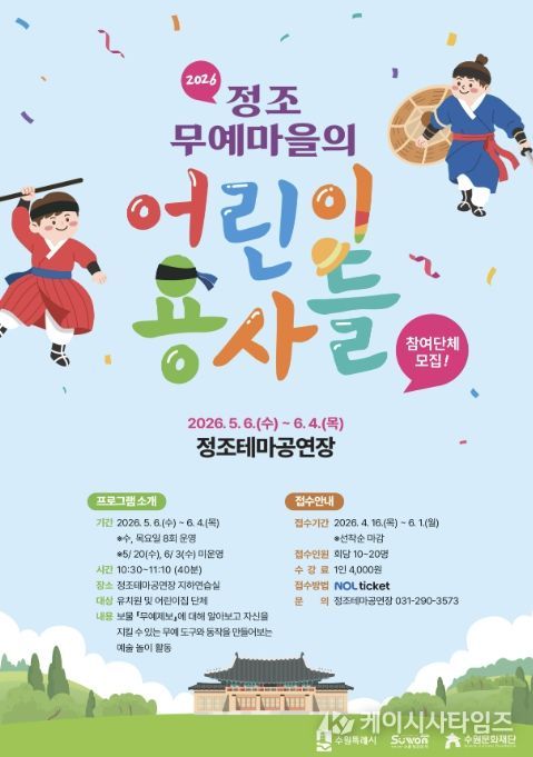 (케이시사타임즈) 수원문화재단 정조테마공연장의 대표 예술교육 프로그램 '정조무예마을의 어린이 용사들'의 상반기 교육이 접수 마감되며 큰 호응을 얻고 있다.