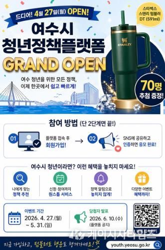 (케이시사타임즈) 여수시는 청년들에게 맞춤형 정책 정보를 제공하고 양방향 소통을 지원하기 위한 ‘여수시 청년정책 플랫폼’을 27일 정식 운영 개시하고, 이를 기념한 특별 이벤트를 진행한다고 밝혔다.