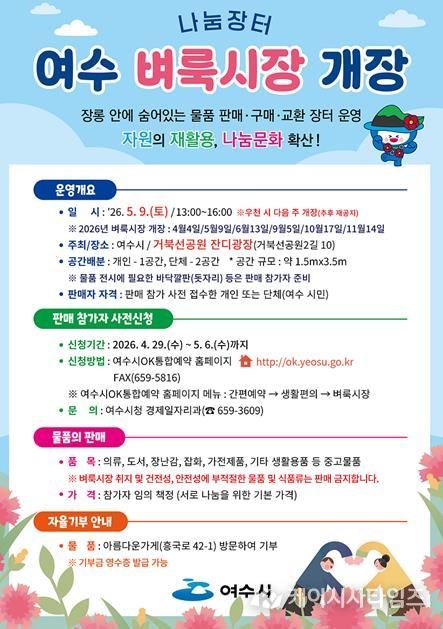 (케이시사타임즈) 여수시는 오는 5월 9일 오후 1시부터 4시까지 거북선공원 잔디광장에서 ‘2026년 제2차 여수 벼룩시장’을 개최한다고 밝혔다.