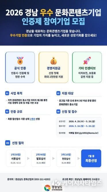 (케이시사타임즈) 경상남도는 ‘2026년 경남 우수 문화콘텐츠기업 인증제’ 참여 기업을 4월 29일부터 5월 29일까지 한 달간 모집한다고 밝혔다.