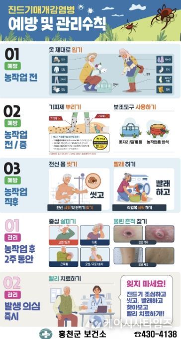 홍천군보건소는 2026년 진드기 매개 감염병 예방 사업을 추진하고 있다. 농업기술센터, 군부대, 경로당 등과 연계해 진드기 노출 위험이 큰 고위험군을 대상으로 예방 교육을 시행하고 있으며, 지역 축제와 면민 체육대회 현장에서도 주민 대상 홍보 활동을 이어가고 있다.