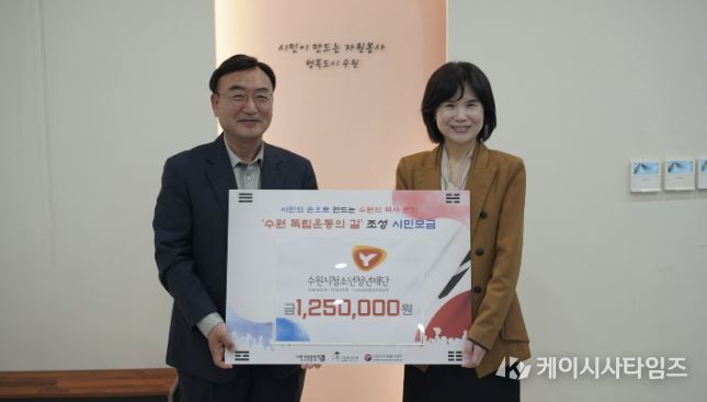 (케이시사타임즈) 수원시청소년청년재단은 28일, 수원시자원봉사센터와 수원 독립운동의 길 추진위원회가 주관하는 ‘수원 독립운동의 길’ 조성 시민 모금에 재단 임직원이 자율적으로 모금한 125만원을 기부했다고 밝혔다.
