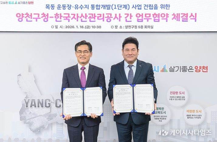 케이시사타임즈 관리자 기자 | 양천구가 1월 16일 한국자산관리공사와 업무협약을 체결하며, 목동운동장·유수지 일대 통합개발(목동MICE)을 위한 첫걸음을 내디뎠다.