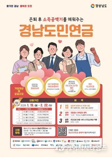 케이시사타임즈 관리자 기자 | 함양군은 군민의 은퇴(60세) 이후 공적연금 수령 전(65세)까지의 소득 공백기를 대비하고 안정적인 노후 준비를 지원하기 위해 '2026년 경남도민연금 지원사업'을 추진하고 가입자를 모집한다고 밝혔다.