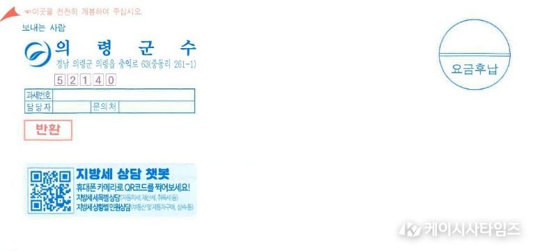 케이시사타임즈 관리자 기자 | 의령군은 지방세 고지서 전면에 ‘지방세 챗봇 상담서비스’ QR코드를 삽입해 발송한다고 밝혔다.