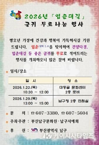 케이시사타임즈 관리자 기자 | 부산 남구는 24절기의 첫 번째 절기인 입춘(2월 4일)을 맞아 구민의 안녕과 길운을 기원하는 '입춘방 나눔행사'를 개최한다고 밝혔다.