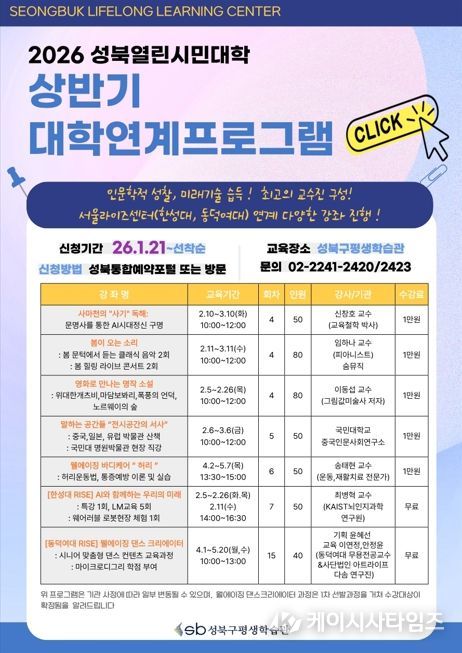 케이시사타임즈 관리자 기자 | 서울 성북구가 2월부터 5월까지 구민을 대상으로 ‘2026 상반기 열린시민대학’을 운영한다.