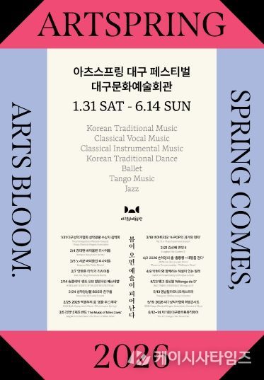 케이시사타임즈 관리자 기자 | 대구문화예술회관은 대구를 기반으로 활동하는 지역 예술인들의 공연을 한데 모아 그들의 예술혼을 집중 조명하는 축제 '2026 아츠스프링 대구 페스티벌'의 16개 공연을 오는 1월 31일부터 6월 14일까지 대구문화예술회관에서 개최한다고 밝혔다.