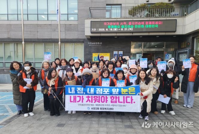 (케이시사타임즈) 인천시 남동구 서창2동 행정복지센터는 최근 통장자율회 53명과 함께 겨울철 안전사고 예방을 위한 ‘내 집, 내 점포 앞 눈 치우기’ 캠페인을 펼쳤다고 27일 밝혔다.