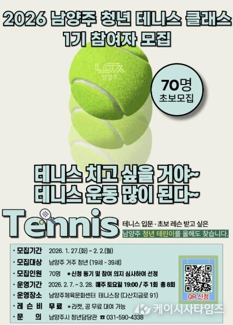 (케이시사타임즈) 남양주시는 27일부터 내달 2일까지 ‘2026 남양주 청년 테니스 클래스 1기’ 참여자를 모집한다고 밝혔다.