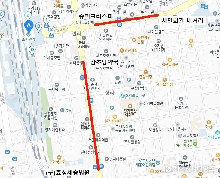단속유예구간은 슈퍼크리스피 세종조치원역점(옛 올포유)에서 시민회관 네거리까지 220m 구간과 감초당 약국에서 옛 효성세종병원까지 360m 구간이다.