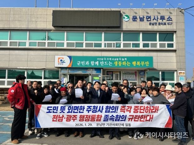 (케이시사타임즈) 무안군 각 읍면 기관사회단체협의회는 29일 전남·광주 행정통합 추진과 관련해 최근 합의 내용에 대한 규탄 성명서를 발표했다.