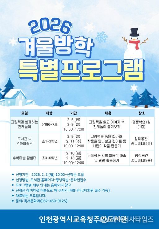 (케이시사타임즈) 인천광역시교육청주안도서관은 관내 유·초등학생에게 다양한 평생학습 기회를 제공하기 위해 2월 6일부터 13일까지 ‘겨울방학 특별프로그램’을 운영한다.