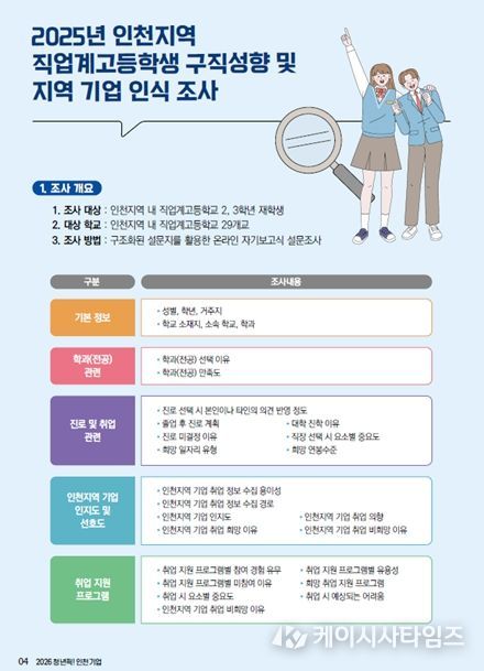 가이드북은 인천시와 중부지방고용노동청(청장 김윤태)이 공동으로 발간한 자료로, 인천지역 직업계 고등학교 학생 3,115명을 대상으로 실시한 실태조사를 바탕으로 제작됐으며, 직업 선택 시 중요하게 고려하는 요소와 인천지역 기업 취업 의향 등 청년들이 궁금해하는 기업 정보를 충실히 담았다.