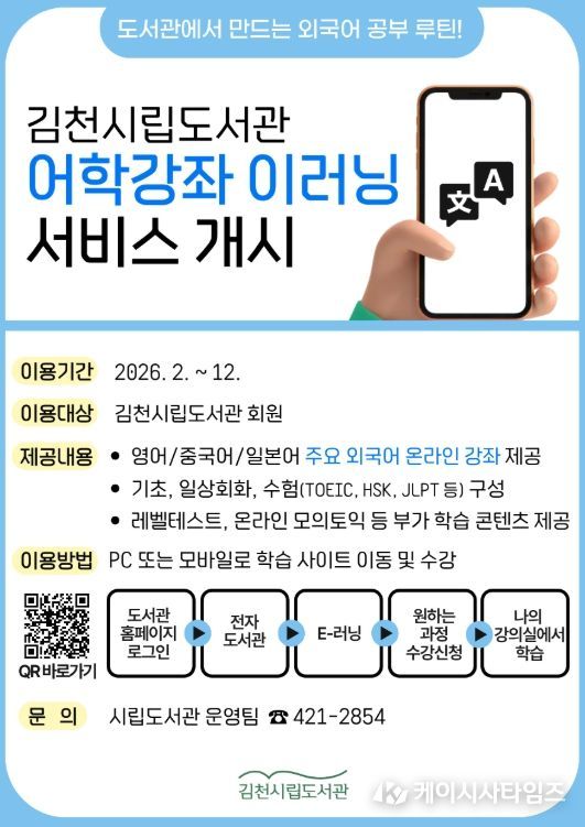 (케이시사타임즈) 김천시립도서관은 시민에게 자기 주도적 외국어 학습 기회를 제공하기 위해 오는 2월부터 '외국어 e러닝' 온라인 강좌 서비스를 운영한다고 밝혔다.