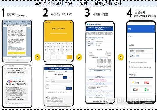 (케이시사타임즈) 부산시는 기존 우편(종이) 송달하고 있는 지방세 관련 각종 고지·안내문을 전자문서 형태로 공인전자문서중계자(카카오, KT, SKT, LGU+) 문자 메시지로 전송하는 '모바일 전자고지 서비스'를 2월부터 본격 시행한다고 밝혔다.