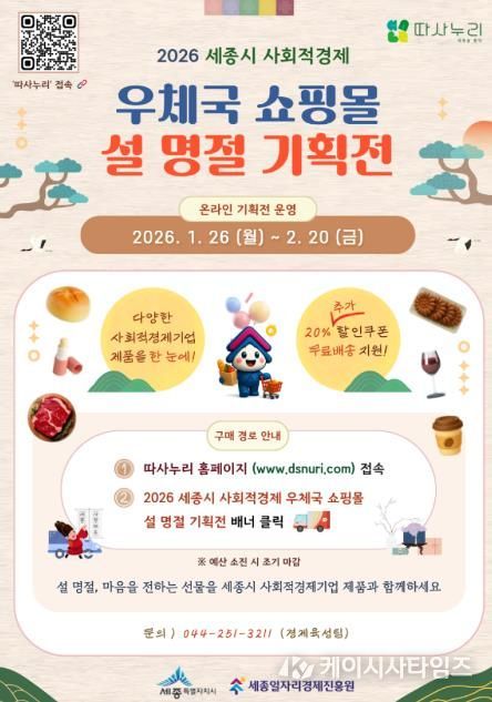 (케이시사타임즈) 세종일자리경제진흥원이 설 명절을 맞아 세종시 사회적경제기업의 온라인 판로 확대와 매출 증대를 위해 ‘2026년 세종시 사회적경제 우체국쇼핑몰 온라인 설 기획전’을 운영한다고 밝혔다.