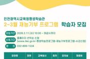 (케이시사타임즈) 인천광역시교육청평생학습관은 오는 23일부터 ‘재능기부 프로그램’을 운영한다. 이번 프로그램은 시민이 강사로 참여해 자신의 전문성과 경험을 공유하는 참여형 평생학습 활동으로, 매월 새로운 주제의 강좌를 통해 생활 속 배움의 기회를 제공한다. 2월부터 운영되는 강좌는 ‘시니어 요가’, ‘시니어 필라테스’, ‘근력 스트레칭’, ‘나를 닮은 꽃그림’, ‘내 마음속의 논어’ 등 총 5가지이다. 수강 신청은 11일 오전 10시부터 평생학습관 누리집에서 선착순으로 진행되며, 자세한 사항은 누리집의 공지사항을 확인하거나 평생교육부로 문의하면 된다.