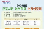 (케이시사타임즈) 군포시 도시농업 활성화 지원사업 보조사업자인 한세대학교가 오는 3월 20일까지 2026년도 군포시민 농부학교 신규 수강생을 모집한다고 밝혔다. 군포시민 농부학교는 군포시민들이 도심 속에서 직접 작물을 재배하며 친환경적인 삶의 태도를 함양하고, 이웃과 소통하는 공동체 문화를 회복하기 위해 마련됐다. 특히 단순한 농사 기술 습득을 넘어 이론과 실습이 병행된 체계적인 커리큘럼을 제공할 예정이다. 올해 모집 규모는 성인반 25구좌, 주말가족반 25구좌, 주말어린이반 20구좌로 총 70구좌이며, 교육은 한세대학교 내 위치한 도시농업지원센터 전용 농장에서 진행된다. 운영 기간은 3월부터 12월까지 약 10개월간이며 총 20강에 걸쳐 절기별 작물 재배법과 생태 교육 등 다채로운 프로그램이 이어진다. 신청 접수는 3월 9일부터 3월 20일까지 진행되며 자세한 커리큘럼 및 접수 방법은 한세대학교 홈페이지 공지사항을 통해 확인할 수 있다. 군포시 관계자는 “도시농업은 먹거리를 생산하는 즐거움을 넘어 기후 위기 시대에 탄소 중립을 실천하는 소중한 발걸음이 될 것”이라며 “많은 시민이 흙을 만지며 정서