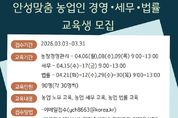 (케이시사타임즈) 안성시농업기술센터가 지역 농업인의 안정적인 영농 활동을 돕기 위해 오는 31일까지 ‘안성맞춤 농업인 경영·세무·법률 교육’ 교육생을 모집한다. 이번 교육은 전문가 특강을 통해 농가 운영 중 발생할 수 있는 경영적, 법적 문제를 사전에 예방하고 해결할 수 있는 역량을 키워주기 위해 마련됐다. 교육은 오는 4월 6일부터 30일까지 주제별 지정된 날짜에 진행된다. 모집 분야는 ▲농업 경영 ▲농업 세무 ▲농업 법률 등 3개 과정이며, 분야별로 30명씩 총 90명을 선발한다. 신청 인원이 초과할 경우 내부 선발 기준에 따라 교육생을 최종 선정할 예정이다. 신청 자격은 농업 경영에 관심 있는 안성시민이라면 누구나 가능하며, 접수는 3월 31일까지다. 참여를 희망하는 시민은 이메일을 보내거나 농업기술센터 농업지도과(보개원삼로 219)를 방문해 신청하면 된다. 시 관계자는 “농업인의 눈높이에 맞춘 경영·법률·세무 전문가 특강이 농가 역량을 강화하는 좋은 기회가 될 것”이라며, “안성 농업의 내실을 다지고 싶은 시민 여러분의 많은 관심과 참여를 바란다”고 말했다.