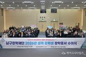 (케이시사타임즈) 울산 남구는 10일 남구청 대강당에서 2026년도 성적우수 장학생 장학증서 수여식을 개최했다. 이날 수여식에는 이사장인 서동욱 남구청장을 비롯한 장학재단 이사, 장학생과 학부모 등 50여 명이 참석해 자리를 빛냈다. 남구장학재단은 앞서 총 91명의 신청자 중 장학재단이사회 심의를 거쳐 대학생 43명을 최종 선발했으며, 이날 선발된 장학생들에게 장학증서를 수여했다. 장학금은 총 1억 7,200만 원 규모로, 대학생에게 1인 최대 400만 원이 지원된다. 특히 이날 수여식에서는 장학생들이 직접 준비한 감사 퍼포먼스가 진행돼 눈길을 끌었다. 장학생들은 재단과 가족을 향한 감사의 마음을 담아 ‘우리는 남구의 미래다’라는 메시지를 함께 외치며 자신들의 다짐과 성장 의지를 표현했다. 이와 함께 최우수 장학생의 진심 어린 소감도 이어졌다. 간호학과 서수민 학생은 “이번 장학금은 단순한 지원을 넘어, 스스로를 돌아보고 앞으로 나아갈 방향을 다시 다짐하는 계기가 됐다”며 “앞으로 환자를 돌보는 간호인으로서 성실히 성장하고, 받은 도움을 사회에 환원할 수 있는