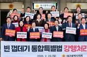 (케이시사타임즈) 대구광역시의회는 2월 23일 오전 11시, 대구시의회 1층 현관에서 대구경북 행정통합 졸속 추진 규탄 성명서를 발표했다. 이날 성명서 발표에 모인 대구시의회 의원들은 통합의 대의에는 공감하나, 권한과 재정이 비어있고 대표성의 균형이 무너진 졸속 통합에는 단호히 반대한다고 목소리를 높였다. 대구시의회가 2024년 12월 통합에 동의한 것은 대구·경북 양 의회가 충분히 협의하고 선거구 획정이나 의원 정수 문제도 조정할 수 있는 충분한 시간적·제도적 여지가 있었으며, 중앙 권한의 실질적 이양과 핵심 특례, 안정적 재정 기반이 법률로 담보되는 ‘진정한 통합’을 전제로 한 결단이었다. 하지만 지금 국회에서 추진되는 통합특별법 수정안은 그 취지나 방향이 현저히 달라졌다고 이번 성명서 발표의 배경을 밝혔다. 또한, 현재 국회 법안에는 긴급 재추진의 핵심 동력이었던 20조 원 규모의 정부 재정 인센티브가 언급조차 없고 재정 특례와 권한 이양의 주요 조항 역시 상당 부분 빠져 숫자만 요란한 ‘속 빈 발표’에 불과한 구체적 담보 없는 재정 약속으로는 통합의 실효성을 말할 수 없다고 강조했다. &nb