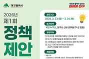 (케이시사타임즈) 대구광역시는 전 국민과 시 산하 공무원의 창의적인 정책 아이디어를 발굴해 시정 발전의 동력으로 활용하고자 ‘2026년 제1회 정책제안 공모’를 개최한다. 이번 공모는 총 4개 분야를 주제로 진행된다. ▲대구 대표 지방정원(하중도) 조성을 위한 아이디어 ▲ 대구시 승용차요일제 참여율 제고 방안 ▲시민 중심의 자발적 소방안전관리 문화 확산 방안 ▲2027 대구세계사격선수권대회의 성공 개최 방안이다. 공모 기간은 2월 23일부터 3월 24일까지 30일간이며, 대한민국 국민이라면 누구나 참여할 수 있다. 제안은 대구시 온라인 참여 플랫폼 ‘토크대구’, 국민신문고, 우편, 방문, 팩스 등을 통해 접수 가능하며, 자세한 사항은 대구시청 홈페이지 공고 게시판에서 확인하면 된다. 접수된 제안은 업무 담당부서에서 창의성과 실시 가능성 등을 기준으로 채택 여부를 사전 검토하고, 이후 제안실무위원회 심의를 거쳐 우수 제안 후보를 선정한다. 선정된 후보에 대해서는 5월 초 시민이 직접 참여하는 온라인 투표 점수(30%)와 전문가로 구성된 제안심사위원회 심사 점수(70%)를 합산해 창안 등