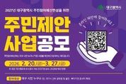 (케이시사타임즈) 대구광역시는 시민의 목소리를 시정에 직접 반영하기 위해 2월 20일부터 3월 27일까지 36일간 ‘2027년도 예산편성을 위한 주민제안사업’을 공모한다. 이번 공모 규모는 총 140억 원 규모로, 공모 분야는 ▲시정 참여형(70억 원) ▲구·군 참여형(40억 원) ▲읍·면·동 참여형(30억 원) 등 총 3개 부문으로 나뉜다. 대구 시민은 물론 대구 소재 직장인과 학생이라면 누구나 참여할 수 있다. 다만, 대구시와 구·군 공무원 및 산하 출연·투자기관에 종사하는 사람은 제외된다. 제안은 주민참여예산 누리집과 이메일, 팩스, 우편 및 방문 접수를 통해 가능하다. 대구시는 참여자 가운데 추첨을 통해 모바일 상품권을 지급하며, 향후 투표를 통해 우수사업으로 선정된 제안자에게는 대구광역시장 표창을 수여할 계획이다. 접수된 사업은 사업부서 검토와 주민참여예산위원회의 숙의·심사, 주민투표 및 총회 승인을 거쳐 선정되며, 시의회 예산심의·의결을 통해 2027년 주민참여예산 사업으로 최종 확정된다. 한편, 대구시는 지난해 주민제안사업 공모를 통해 ▲불로고분공원 환경개선