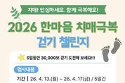 (케이시사타임즈) 삼척시보건소 치매안심센터가 치매 예방에 좋은 ‘걷기’를 실천해 치매에 대한 인식을 개선하고 치매 극복을 기원하기 위해 오는 4월 13일부터 17일까지 5일간 '2026 한마음 치매극복 걷기 챌린지'를 운영한다. 이번 챌린지는 스마트폰을 소지한 삼척시민이라면 누구나 참여할 수 있다. 참여 희망자는 스마트폰에 모바일 걷기 애플리케이션인 ‘워크온’을 설치한 뒤, ‘뚜벅뚜벅, 삼척을 걷다’ 커뮤니티에 가입하여 ‘한마음 치매극복 걷기’ 챌린지 참여하기를 누르면 된다. 챌린지 목표는 5일 동안 총 3만 보를 걷는 것이며, 무리한 운동을 방지하기 위해 하루 걸음 수는 최대 6,000보로 제한된다. 기간 내에 목표를 달성한 참가자 중 선착순 300명에게는 소정의 인센티브를 지급할 예정이다. 목표 달성 후 앱 내의 ‘받기’ 버튼을 반드시 클릭해야 참여가 완료된다. 시 관계자는 “이번 걷기 챌린지를 통해 시민들이 치매에 대한 인식개선과 치매 예방의 중요성을 인식하고, 일상 속에서 건강한 생활 습관을 실천하는 계기가 되길 바란다”라며 지역 주민들의 적극적인 관심과 참여를 당부했다.