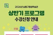 (케이시사타임즈) 인천시 남동구 평생학습관은 구민의 자기 계발과 지적 성장을 위해 오는 24일부터 ‘2026년 상반기 평생학습 프로그램’ 학습자를 모집한다고 20일 전했다. 상반기 프로그램은 3~5월까지 운영되며, 일상의 활력을 더하고 실질적인 역량을 강화할 수 있는 실용적인 강좌들로 꾸려졌다. 특히, ‘2025년 평생교육 강사학교’ 과정을 이수한 강사들이 지역사회와 시민의 삶을 주제로 직접 기획⋅개발한 강좌들이 다수 개설됐다. 주요 강좌로는 ▲남동구의 색(色)다른 이야기 ▲나의 감정을 안아주는 예술이야기 ▲생성형 AI로 만드는 나의 영상 콘텐츠 ▲그림책과 공예 테라피로 나를 찾는 ‘다시, 봄’ 등 모두 4개 과정이 운영된다. 이와 함께 전 연령층의 학습 수요를 반영한 다양한 강좌도 운영된다. ▲시니어(65+) 스마트폰 입문 클래스 ▲바리스타 2급 자격과정 ▲오뒷세우스 깊게 읽기 ▲장애인과 비장애인이 함께하는 생태탐방 등 실용성과 인문적 소양을 아우르는 프로그램이 준비돼 있다. 수강 신청은 남동구평생학습관 홈페이지에서 선착순으로 진행되며, 남동구민 또는 남동구 내 직장인이면