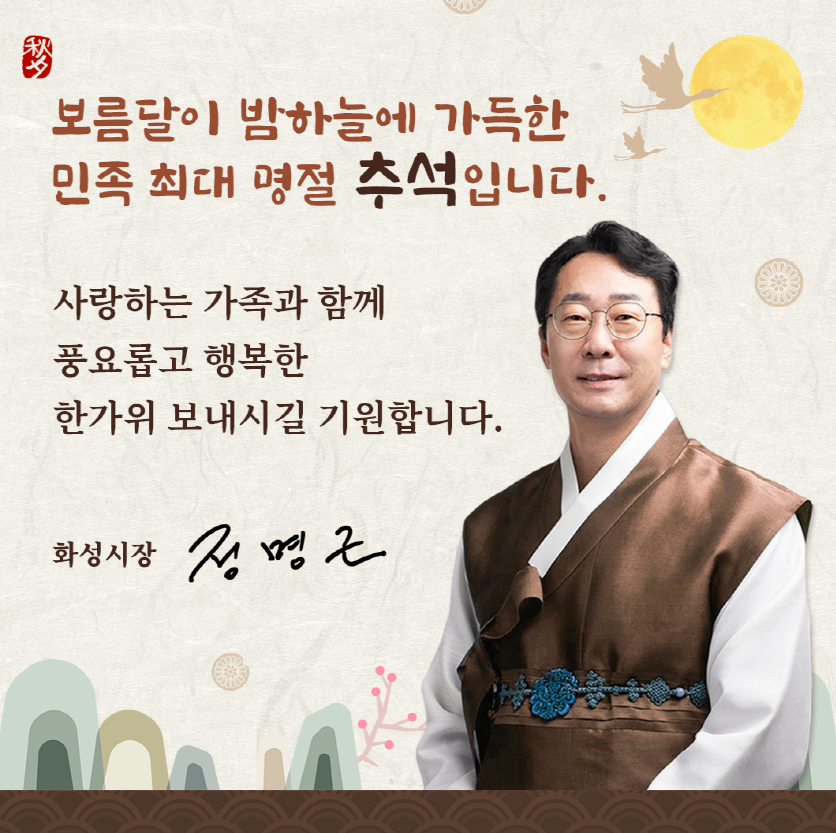 추석 명절을 앞두고 정명근 화성시장이 시민들에게 따뜻한 명절 인사를 전했다. 정 시장은 "보름달이 밤하늘을 가득 채우는 민족 최대의 명절, 추석을 맞아 사랑하는 가족과 함께 풍요롭고 행복한 한가위를 보내시길 기원합니다"라며 시민들에게 따뜻한 마음을 전했다. 정 시장은 더위와 치솟는 물가로 인해 고단한 삶을 살아가는 시민들을 위로하며, "지구에서의 삶이 고달프고 힘들지만, 잠시 그 고단함을 내려놓고 화성에서 힐링의 시간을 보내시길 바랍니다"라고 전했다. 이어 "화성은 일상에서 지친 몸과 마음을 치유할 수 있는 도시입니다. 이곳에서 잠시나마 편안함을 느끼시길 바랍니다"라며 화성시가 시민들에게 휴식과 회복의 공간이 될 수 있음을 강조했다. 정 시장은 앞으로도 시민들이 더욱 나은 삶을 살아갈 수 있도록 노력하겠다는 다짐을 전하며, 이번 추석이 시민들에게 따뜻한 위로와 힘이 되길 바란다고 덧붙였다.