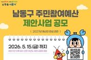 (케이시사타임즈) 인천시 남동구는 주민이 직접 지역에 필요한 사업을 제안하고 예산 편성에 참여할 수 있도록 ‘2026년 주민참여예산 제안사업 공모’를 오는 5월 15일까지 진행한다고 2일 밝혔다. 주민참여예산제도는 예산의 편성부터 집행, 결산까지 전 과정에 주민이 참여하는 제도로, 재정 운영의 투명성과 건전성을 높이고 주민 의견을 구정에 반영하기 위해 운영되고 있다. 참여 대상은 남동구민뿐만 아니라 남동구 소재 직장인과 단체까지 포함되며, 제안은 남동구 누리집을 통한 온라인 신청과 함께 사업 제안 신청서를 작성해 우편·팩스·방문으로도 가능하다. 이번 공모는 일상생활 속 불편 해소와 지역 문제 개선을 위한 공공성 있는 사업을 대상으로 하며, 제안사업은 건당 최대 5억 원 이내에서 신청할 수 있다. 다만 예산이 수반되지 않거나 법령 및 예산편성 기준에 맞지 않는 사업, 특정 단체 지원 또는 특정 제품 홍보를 목적으로 하는 사업, 단순 행사·축제성 사업, 중장기 계획이 필요한 사업 등은 공모 대상에서 제외된다. 접수된 제안사업은 관련 부서의 타당성 검토와 주민참여예산위원회 심의, 주민 온라인