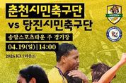 (케이시사타임즈) 춘천시민축구단이 오는 19일 홈경기 3연승에 도전한다. 춘천시민축구단은 19일 오후 2시 송암스포츠타운 주경기장에서 당진시민축구단을 상대로 2026 K3리그 홈경기를 치른다. 이번 경기는 홈 3연승 달성과 함께 리그 상위권 진입을 위한 중요한 분수령이 될 전망이다. 특히 이번 경기는 4월 20일 ‘장애인의 날’을 기념해 다양한 체험 프로그램이 함께 운영된다. 경기장 일대에서는 장애인체육 종목인 한궁, 슐런, 휠체어 체험 등이 마련돼 시민 누구나 참여할 수 있으며 에스코트 키즈 역시 명진학교 학생들이 함께해 의미를 더할 예정이다. 경기 당일에는 선수단 팬사인회를 비롯해 푸드트럭 운영, 선수 사생대회 등 다양한 참여형 이벤트도 함께 열려 경기장을 찾은 시민들에게 즐거움을 제공할 계획이다. 또한 최근 기온이 상승함에 따라 관람객 편의와 안전을 고려해 관람 구역을 기존 가변석이 아닌 그늘이 확보된 W석 중심으로 운영할 예정이다. 치어리더와 함께하는 응원전도 펼쳐져 현장 분위기를 더욱 뜨겁게 달굴 것으로 기대된다. 춘천시는 홈경기마다 이