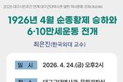 (케이시사타임즈) 대구문화예술진흥원 박물관운영본부 소속 대구근대역사관은 2026년 대구시민주간 연계행사로 4월 24일 오후 2시에 ‘1926년 4월 순종황제 승하와 6·10만세운동 전개’를 주제로 전문가 특강을 개최한다. 올해 2월 말부터 대구문화예술진흥원 박물관운영본부 소속 대구시립 3개 박물관은 대구시민주간 연계행사로 ‘나라를 지킨 대구, 大邱 정신!’이란 주제로 전문가 특강과 시내 답사, 장거리 답사, 문화공연, 체험학습 등 다채로운 프로그램으로 시민들과 의미 있게 만나고 있다. 대구근대역사관은 ‘대구 독립운동 알기’ 주제 마지막 강연으로, 올해 100주년을 맞는 6․10만세운동을 재조명하는 ‘1926년 4월 순종황제의 승하와 6․10만세운동 전개’를 마련했다. 순종 승하일인 4월 25일에 맞추어 강의 날짜를 정했으며, 강의에서는 순종 장례 전개 과정을 살펴보고 인산일(因山日)에 일어난 6․10만세운동 흐름과 의미를 짚어본다. 특히 대구 독립운동사에서 크게 주목받지 못한 6·10만세운동 전개 과정에서 대구·경북 사람들의 활동에 대해 알 수 있는 좋은 기회가 될 것으로 기대하고 있다. &n