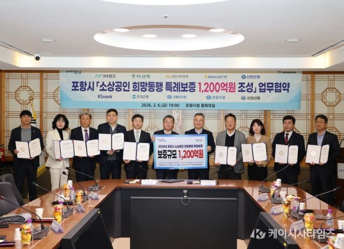 (케이시사타임즈) 포항시는 자금 조달에 어려움을 겪는 소상공인을 지원하기 위해 6일 경북신용보증재단 및 협약 금융기관과 총 1,200억 원 규모의 ‘희망동행 특례보증재원’ 조성을 위한 업무협약(MOU)을 체결했다.