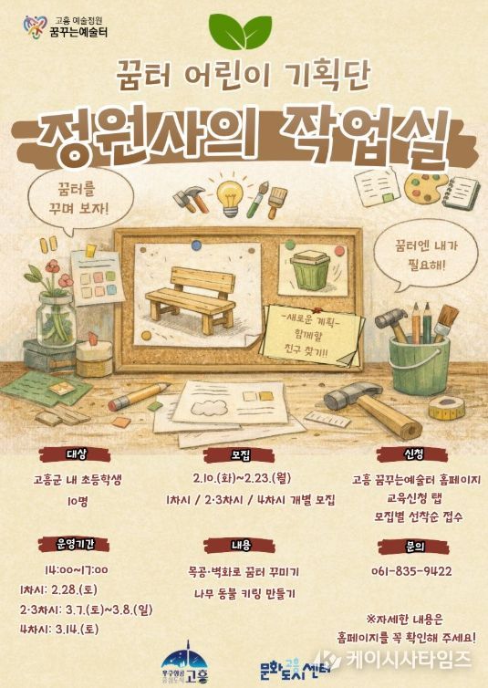 (케이시사타임즈) 고흥군은 오는 2월 10일부터 23일까지 꿈터 어린이 기획단 '정원사의 작업실'에 참여할 지역 내 초등학생 10명을 선착순으로 모집한다고 밝혔다.