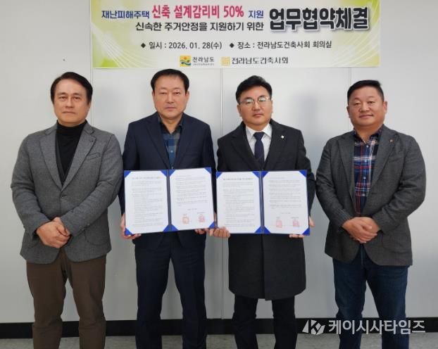 (케이시사타임즈) 전라남도는 태풍·집중호우 등 자연재난으로 주택 전파·반파 피해를 입은 도민의 신속한 주거 안정을 위해 대한건축사협회 전남도건축사회와 설계·감리비를 50% 감면하는 업무협약을 했다고 밝혔다.
