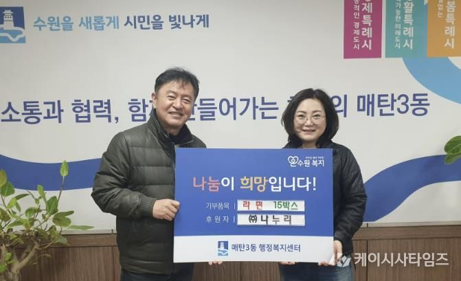 (케이시사타임즈) 수원시 영통구 매탄3동 행정복지센터는 지난 6일, 관내 폐기물 수거업체인 ㈜나누리로부터 설 명절을 맞아 어려운 이웃을 위한 라면 15박스를 기탁받았다고 밝혔다.