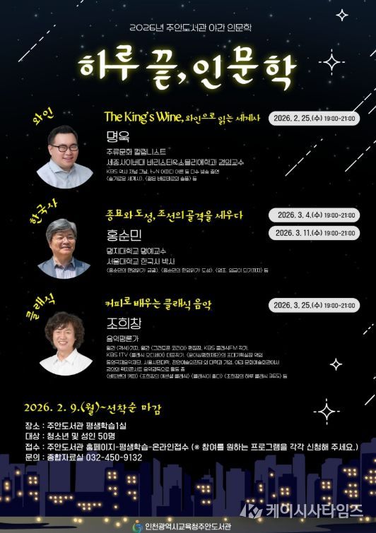 (케이시사타임즈) 인천광역시교육청주안도서관은 2월부터 3월까지 시민들이 다양한 인문학 주제를 접할 수 있는 야간 인문학 프로그램 ‘하루 끝, 인문학’을 운영한다.