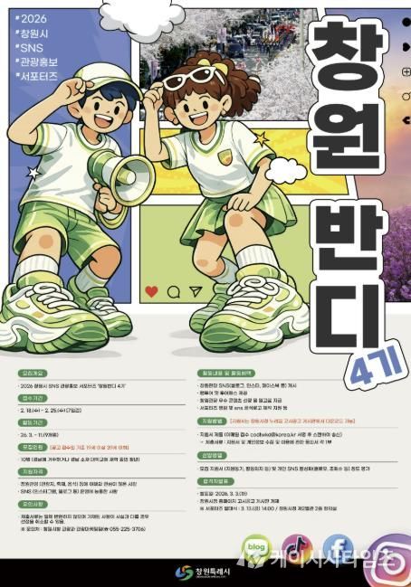 (케이시사타임즈) 창원특례시는 창원 관광의 매력을 알릴 참신한 온라인 콘텐츠를 발굴하고 시민과 소통하는 관광홍보를 강화하기 위해 '2026 창원시 SNS 관광홍보 서포터즈 ‘창원반디 4기’'를 모집한다고 밝혔다.