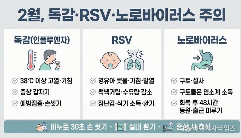 (케이시사타임즈) 평택시는 2월은 실내 생활이 늘고 환기 부족으로 독감(인플루엔자)·호흡기세포융합바이러스(RSV)·노로바이러스 등 감염병이 유행할 수 있다며 시민들에게 개인위생 수칙 준수를 당부했다.