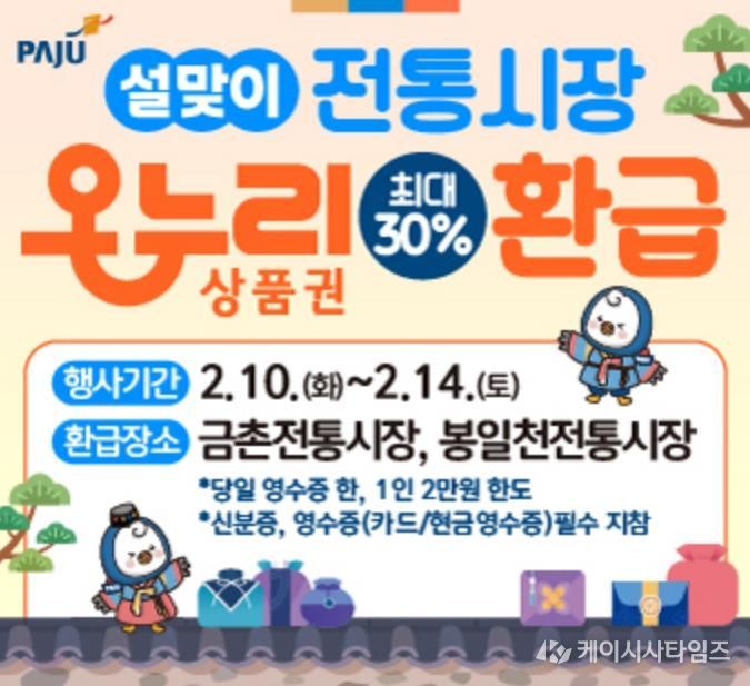 (케이시사타임즈) 파주시는 2026년 설 명절을 맞아 고물가로 인한 시민들의 가계 부담을 덜고 지역 전통시장 활성화를 도모하기 위해 ‘설맞이 농축산물 온누리상품권 환급 행사’를 실시한다.
