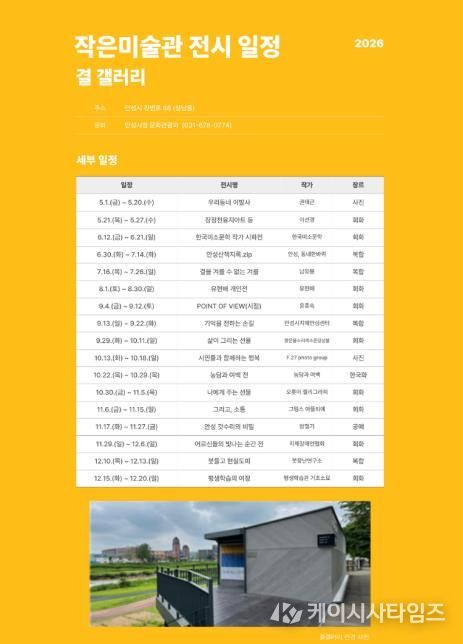 (케이시사타임즈) 안성시는 2월 9일 ‘안성시 작은미술관(결갤러리, 시옷갤러리) 전시 공모’ 심사 결과를 발표하고, 총 31개의 전시를 최종 선정했다고 밝혔다.
