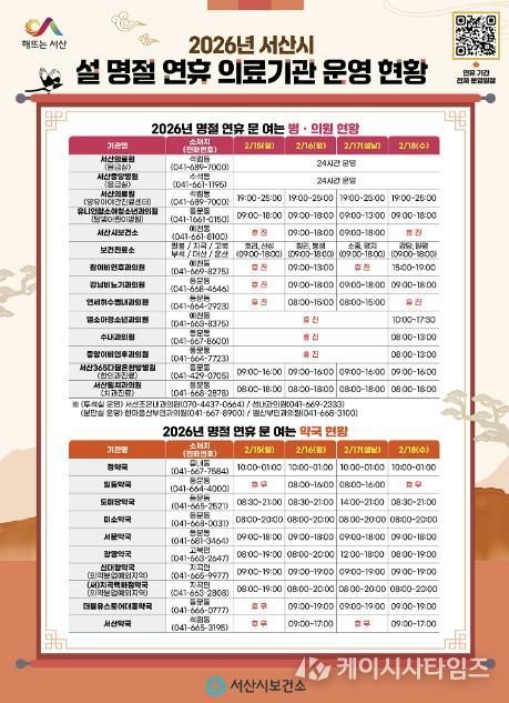 한편, 설 연휴 기간 문 여는 의료기관에 대한 정보는 서산시보건소 누리집, 응급의료정보센터, ‘응급똑똑’ 모바일 앱 등에서 확인할 수 있다.