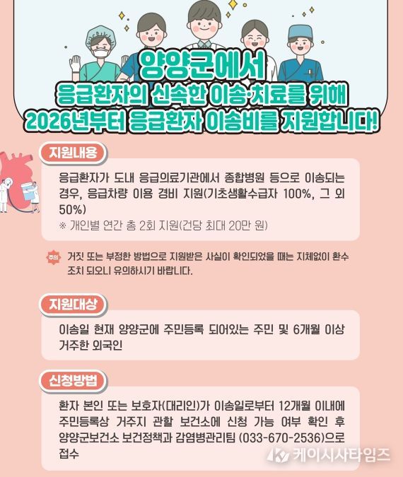 (케이시사타임즈) 양양군이 응급환자의 신속한 이송과 치료, 의료 사각지대 해소를 위해 응급환자 이송비 지원사업을 올해도 지속 추진한다.
