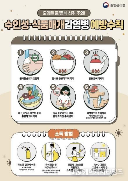 또한 연휴 기간 음식 관리가 소홀해질 경우 수인성·식품매개감염병이 발생할 수 있다. 특히 겨울철에 많이 발생하는 노로바이러스 감염증 환자가 높은 수준을 보이고 있어 각별한 주의가 필요하다. 노로바이러스는 사람 간 전파가 가능하므로 귀가 후와 식사 전에는 30초 이상 비누로 손을 씻고, 음식은 흐르는 물에 세척한 뒤 85℃ 이상에서 1분 이상 충분히 익혀 먹어야 한다. 해외여행 시에도 오염된 식수와 음식 섭취로 세균성 이질, 콜레라 등에 감염될 수 있어 주의해야 한다.