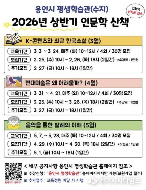 (케이시사타임즈) 용인특례시는 25일부터 수지구에 있는 용인시평생학습관에서 인문학 산책 수강생을 모집한다고 13일 밝혔다.