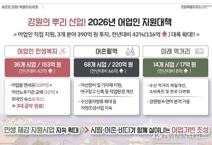 이번 어업인 지원 대책은 어촌 현장의 경영 부담을 완화하고 안정적인 조업 여건을 조성하기 위해 마련된 것으로, 민생복지, 어촌활력 증진, 미래 먹거리 산업 등 3개 분야에 총 390억 원을 투입한다. 이는 전년보다 116억 원(42%) 증가한 규모다.