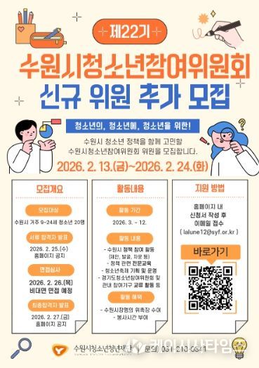 (케이시사타임즈) 수원시청소년청년재단(이사장 최종진)은 수원시 청소년의 정책 참여 확대와 권익 증진을 위해 '제22기 수원시청소년참여위원회' 위원을 추가 모집한다고 밝혔다.